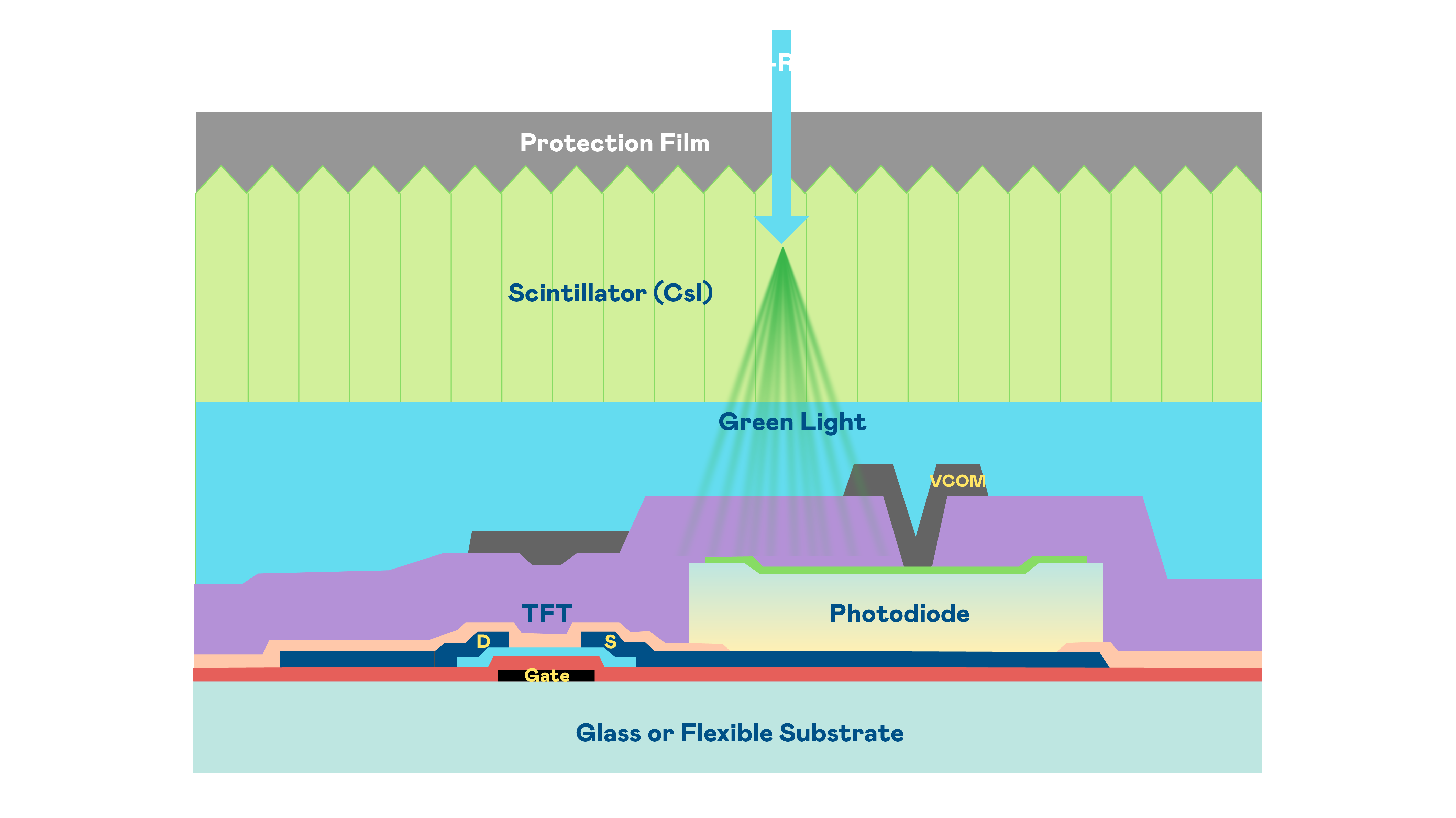 星空电子的X光影像感测阵列使用薄膜电晶体 (TFT) 作为每个像素的读取开关,搭配光电二极体(Photodiode)的光电转换元件,用以感测X光影像讯号。